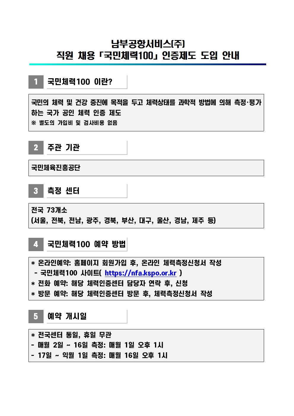 국민체력100 인증 제도가 남부공항서비스(주) 채용 우대사항으로 도입 될 예정이오니,
