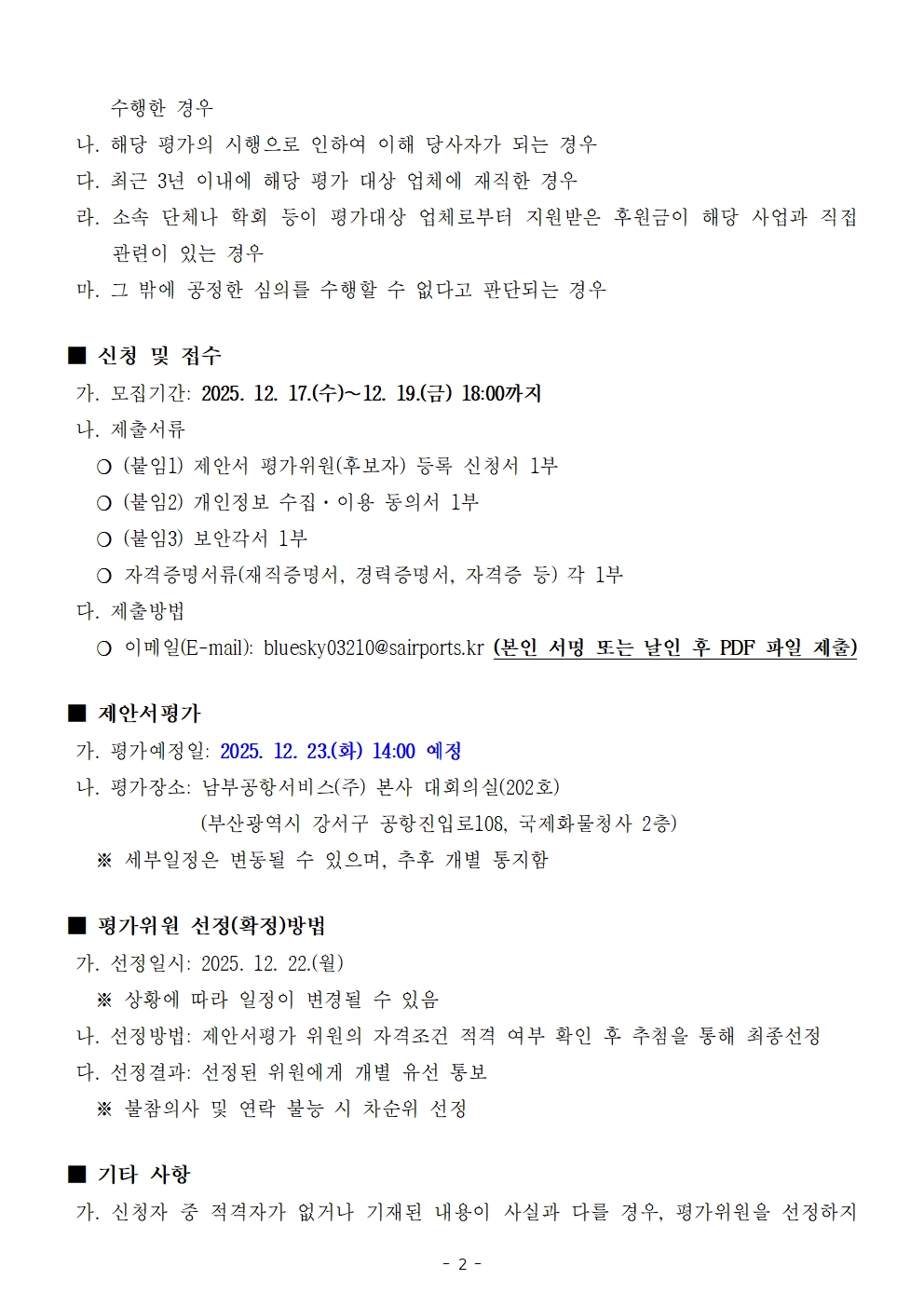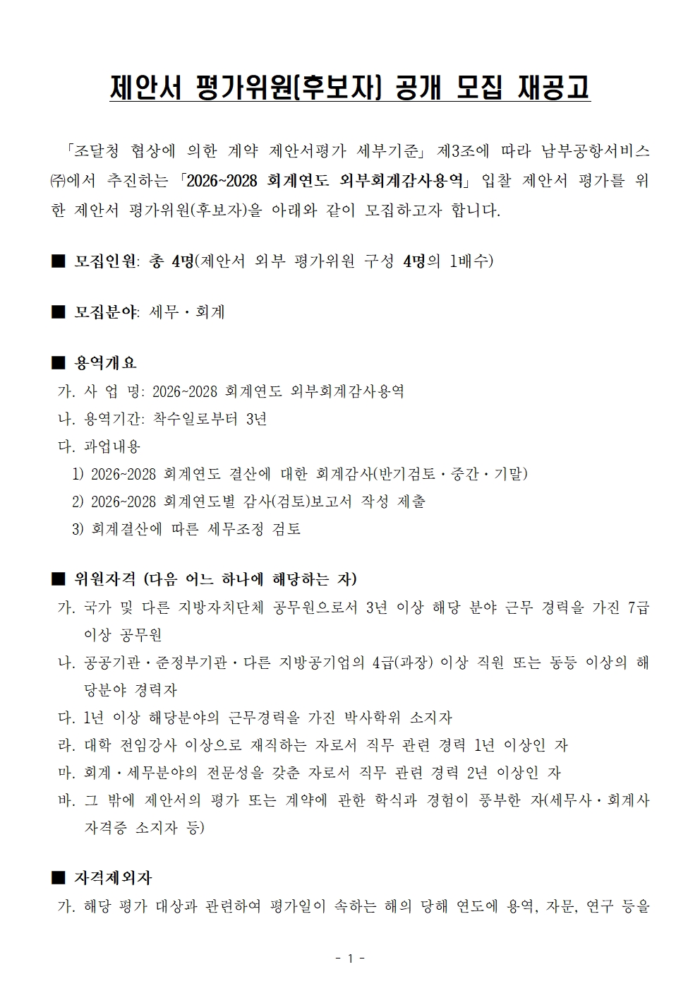 2026~2028 회계연도 외부회계감사용역 제안서 외부 평가위원 후보자 공개 모집 재공고(~12/19)